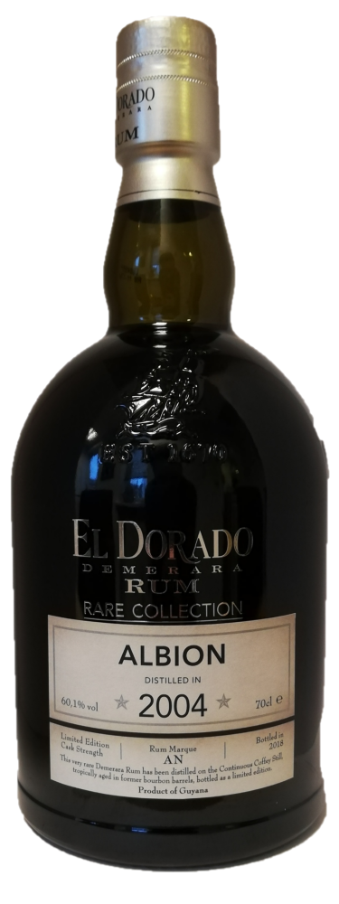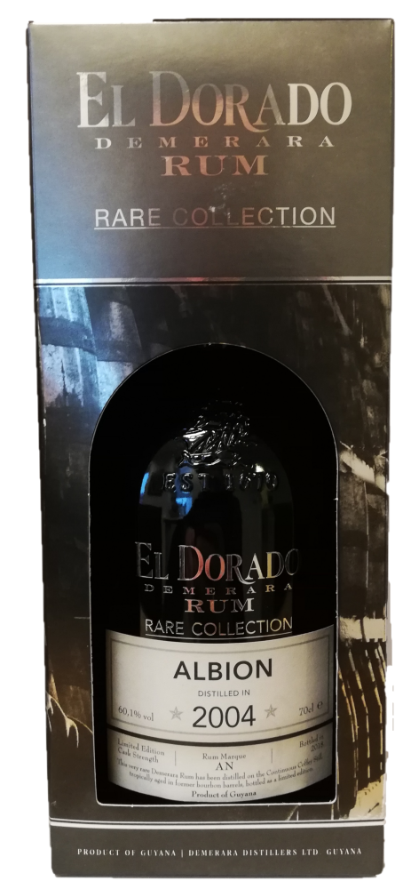 El Dorado Albion 2004 Rare Collection Rum er tropisk lagret i 14 år og tappet ved fadstyrke på 60,1%. Duft: melasse, vanilje, brændt sukker, kakao og krydderier. Smag: brunt sukker, toffee, karamel, honning og egetræ.