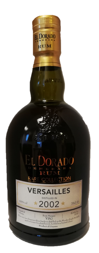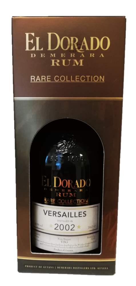 El Dorado Versailles 2002 Rare Collection er fremstillet af Demerara Distillers Limited (DDL) i Guyana, og her besidder man de eneste tilbageværende destilleringsapparater af træ: Enmore (wooden continuous coffey still), Port Morant (wooden double pot still) og Versailles (wooden single pot still).