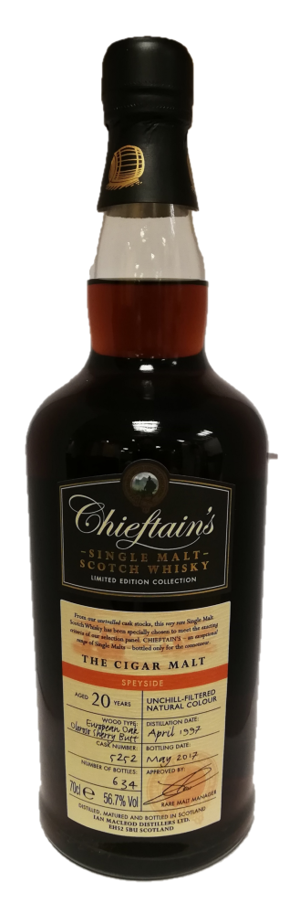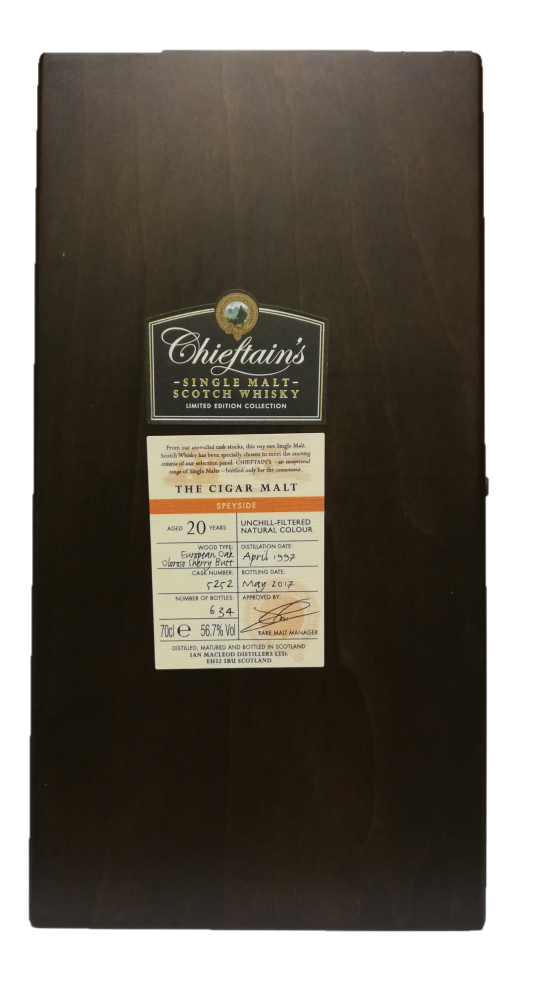 Single malt Scotch whiskey from an unveiled distillery in the Speyside region, independently bottled by Ian Macleod for Chieftain's. This term was distilled in April 1997 and left to age for 20 years in a single Oloroso sherry ass until May 2017. It's named The Cigar Malt, so if you enjoy a cigarette and whiskey pairing, this should be perfect for you . 634 bottles were produced.